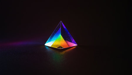 A crystal pyramid prism sits on a reflective surface, capturing a single beam of light and transforming it into a brilliant display of color.