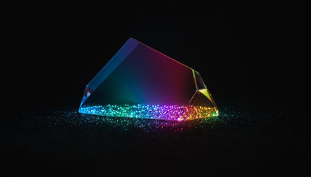 A crystal prism sits on a surface while light refracts, casting vibrant rainbow patterns around the area.