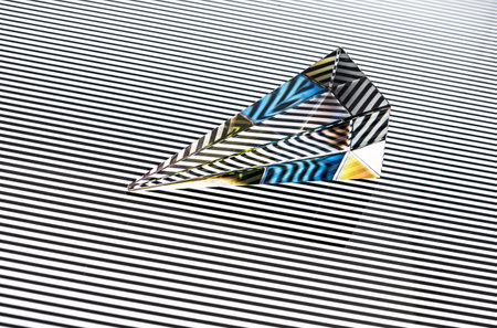 Glass pyramid prism with colorful light reflection on white horizontal stripe on black background