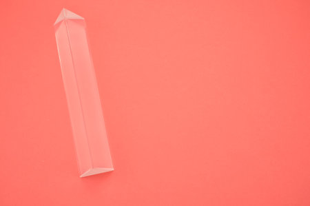 crystal transparent pyramid with light reflection on orange background, horizontal crop
