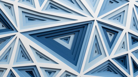 presents a striking abstract geometric pattern composed of numerous layered triangles. The triangles are arranged in a symmetrical, repeating formation, creating a sense of depth and visual complexity. Shades of blue and white are used, with darker blues forming the inner layers and white forming the outer edges, giving the impression of carved or folded surfaces. The clean lines and precise arrangement make it a modern and visually engaging