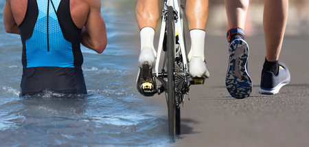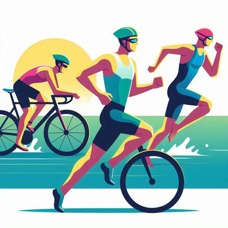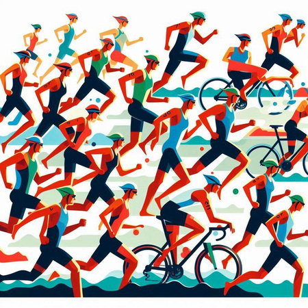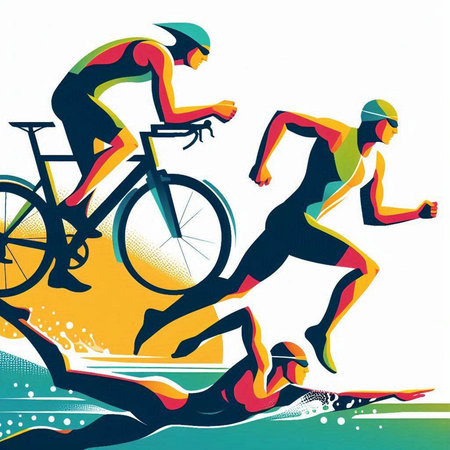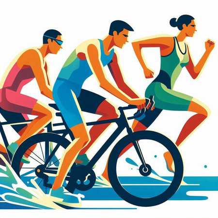 Athletes passionately compete in a triathlon, transitioning seamlessly between swimming, cycling, and running.