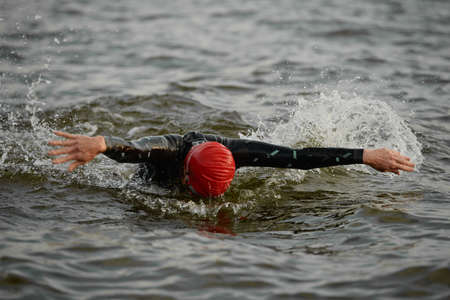 Focused swimmer in black wetsuit and red cap propels through lake, capturing essence of determination and training. Concept of sport competition, workout, recreation, healthy lifestyle.