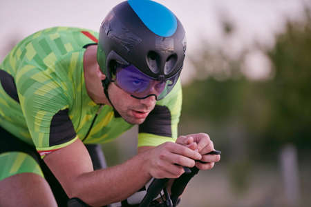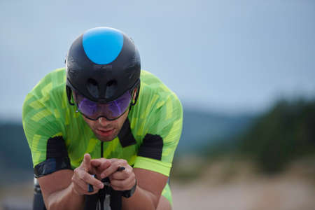 Close up photo of an active triathlete in sportswear and with a protective helmet riding a bicycle. Selective focus