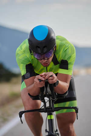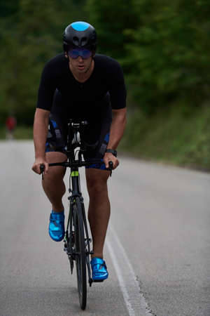 triathlon athlete riding professional racing bike at workout on curvy country road