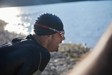 Professional triathlete before swimming in rivers open water. Man wearing swim equipment practicing triathlon on the beach in summers day.