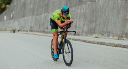 Triathlete riding his bicycle during sunset, preparing for a marathon. The warm colors of the sky provide a beautiful backdrop for his determined and focused effort.
