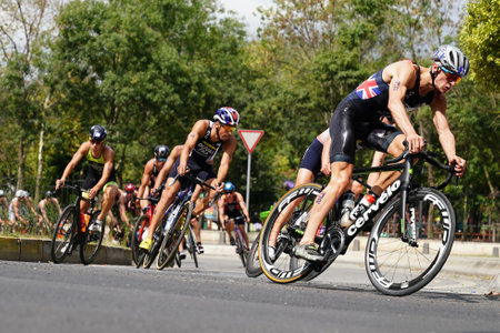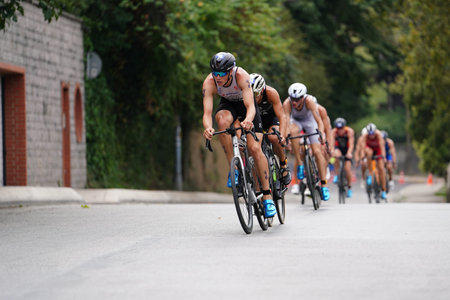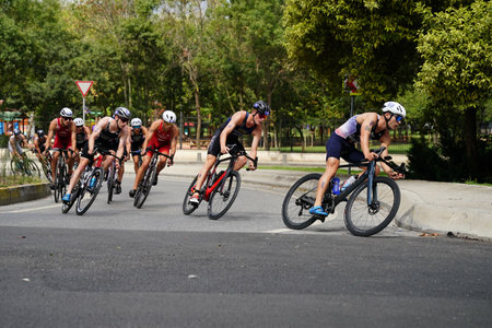 ISTANBUL, TURKIYE - AUGUST 31, 2024: Athletes competing in cycling component of Europe Triathlon Cup in Istanbul