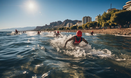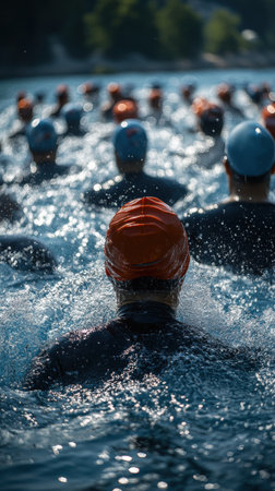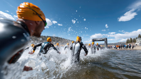 A thrilling scene captures athletes as they burst from the cool water during an open water swim competition. Bright swim caps and wetsuits signify teamwork and sportsmanship.