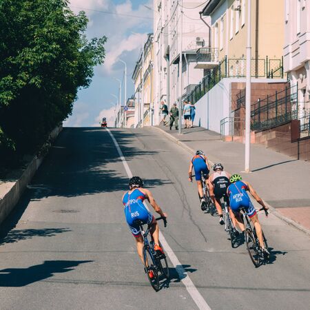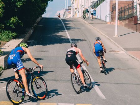 KAZAN, RUSSIA - AUGUST 5, 2018: Last part of triathlon race - by bycicle in the city.