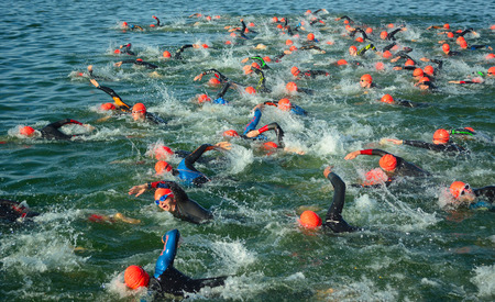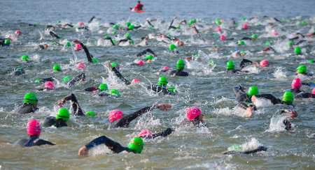 LIMA, PERU - APRIL 22th 2018: Ironman 70.3. Starting for the swimming test of the athletes of the Ironman 70.3