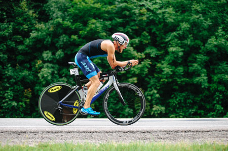 KHARKIV, UKRAINE - August 2, 2020: Triathon biking cyclist triathlete riding racing bike during ironman competition. Road cycling athlete in tri suit and helmet. Public events are allowed. Europe sport during CV pandemic.