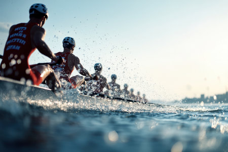 Rowers power through water in unison, splashing droplets as the sun sets, creating a serene backdrop.