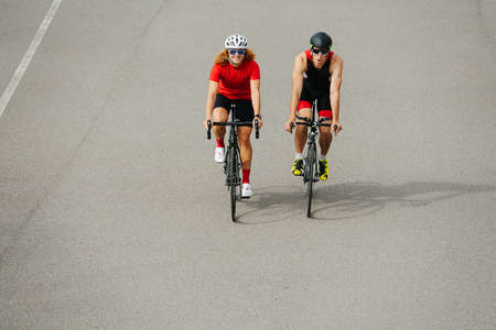 Athletic couple biking on a wide asphalt road on a summer day. They have slim bikes and professional gear. High angle.