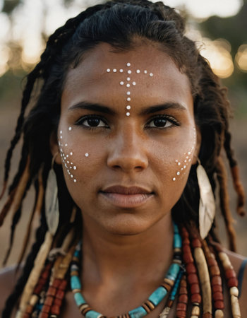 A young Aboriginal Australian woman stands confidently, her striking features highlighted by intricate face paint and vibrant jewelry.