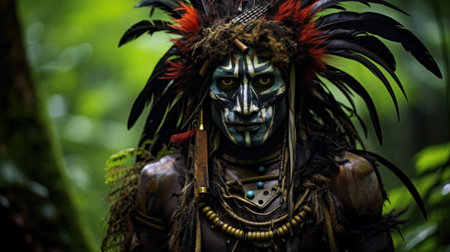 Person dons a tribal mask and headdress, embodying ancestral spirits in a natural setting