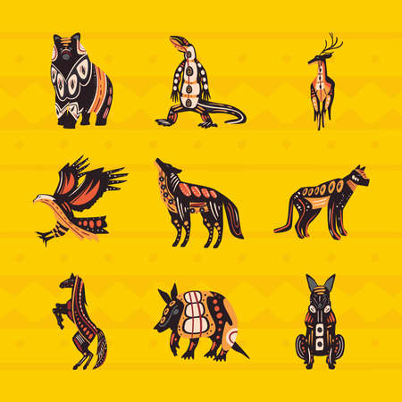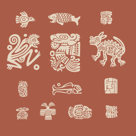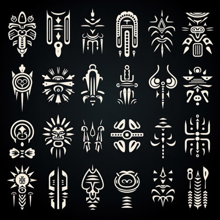 Native american indian tribal vector icons set. Aztec-inspired, abstract symbols. White vector illustrations on black background.