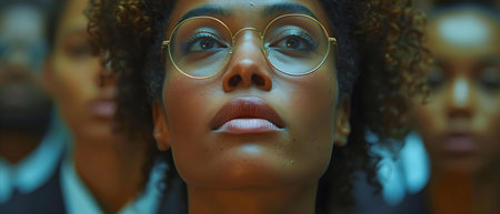 Close up portrait of young woman with glasses, displaying look of curiosity and wonder. background features blurred faces, creating sense of depth and intrigue