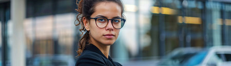 Confident businesswoman in urban setting, with glasses and assertive gaze, ideal for corporate, success, or leadership themes. Generative AI