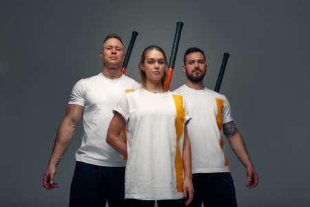 Two men and woman aikido fighters with wooden fight stick posing in studio, fight demonstration
