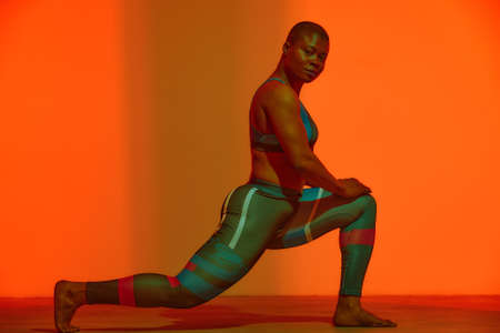 Happy african american woman wearing sportive clothes showing plus size hips. Body positive concept. Yellow light on background