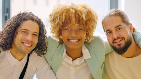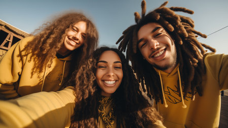 Three happy young adults smiling joyfully outside, symbolizing friendship and diversity