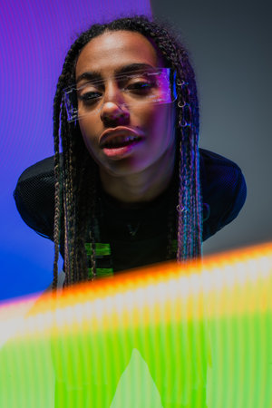 Stylish african american woman in smart glasses looking at camera on colorful background