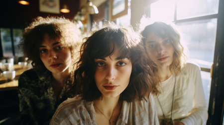 Three individuals share a captivating moment under soft lighting, showing a blend of natural beauty and elegance with an intense gaze. Perfect for creative projects. Generated A.I.