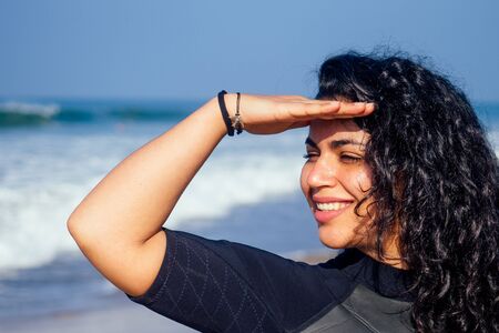 indian girl put her hand to forehead to shield her eyes from the sun looks away in Goa India beach