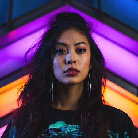 Asian woman fashion portrait on abstract colorful background. Female model looking at camera, neon colored lighting. Created with Generative AI
