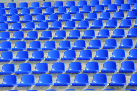 Stadium seats, France flag color. Soccer, football or baseball stadium tribune without fans. End of the game.