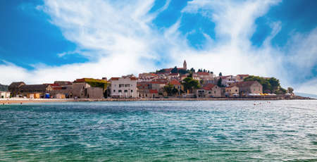 Panoramic summer cityscape of Trogir town. Picturesque morning seascape of Adriatic sea. Beautiful world of Mediterranean countries. Traveling concept background.