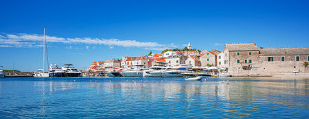 Sevid, Croatia, 19 august 2019 panorama view with boats on sea. Old mediterranean travel destination and vacation in sunny day.