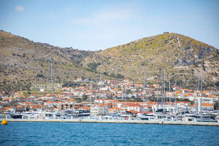 Trogir, Croatia - 27.03.2021: View from water of port and marina in Trogir, Croatia