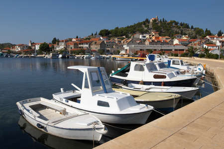 Old boats in marina in the old town of Betina on Murter island in Dalmatia, Croatia. Adriatic seascape.