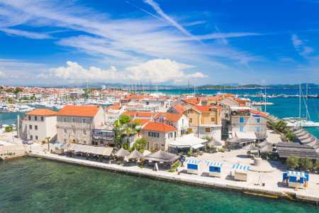 Aerial view of harbor in touristic city and moored yachts. Marina Frapa in Rogoznica, Croatia. Coastal cityscape in Adriatic sea. Travel concept