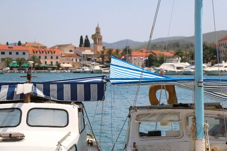 Amazing view of yacht marina and old town Supetar, Brac island, Croatia. Beautiful sunny day.