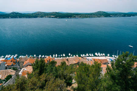 View of the sea and the pier with white yachts from behind the roofs of old houses in Sibenik