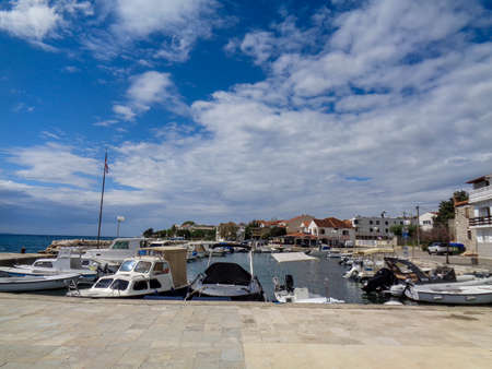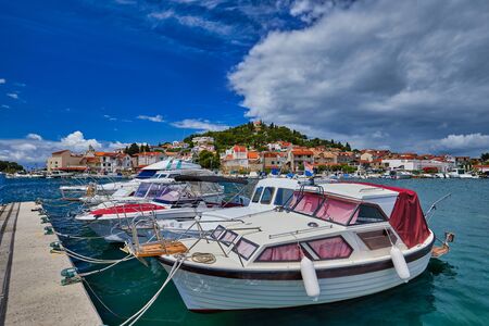 Fishing and sailing boats at the harbor. Sunny summer view of Tribunj port. Morning seascape, Adriatic sea, Croatia, Europe. Beautiful world of Mediterranean countries. Traveling concept background.