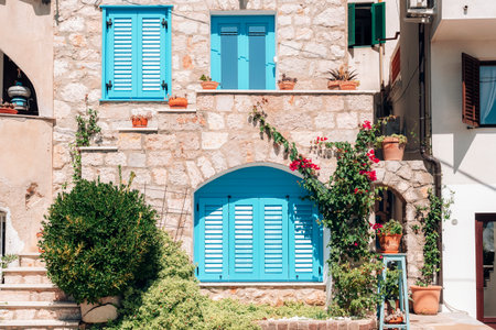 Beautiful facade of stone building with turquoise shutters in mediterranean style