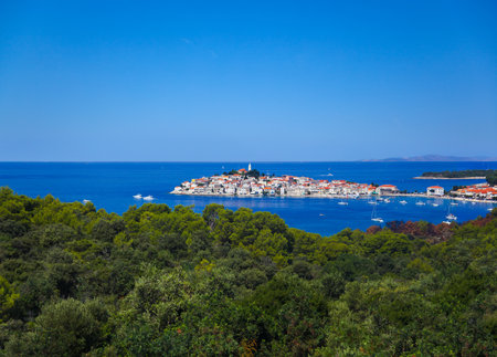 Scenic seascape of Adriatic sea with city of Primosten and surrounding islands