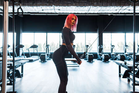 Young fit woman trains misci triceps in crossover exercise machine with ropes. Girl trains arms in modern gym