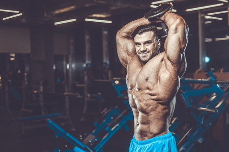 Muscular man working out in gym doing exercises at triceps, strong male naked torso abs.