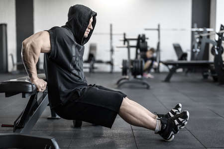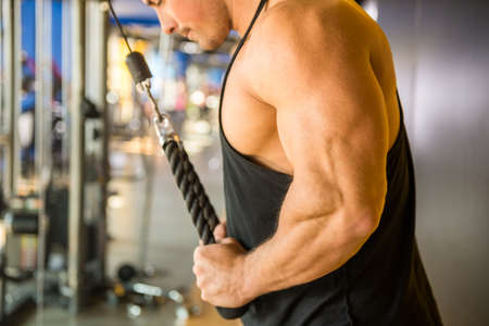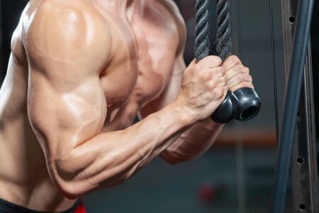 Close up of strong muscular man training his triceps using sport equipment in the modern gym