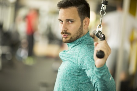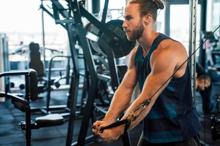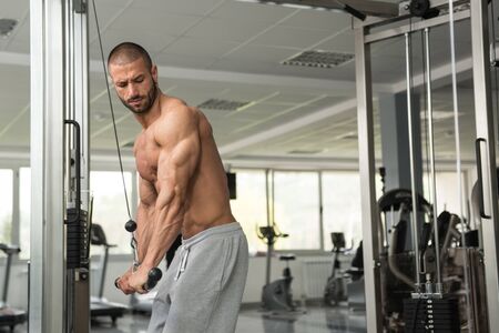 Sportsman doing exercises with cable machine tricep in the fitness gym, Fit exercising focus bicep and shoulder muscle on active healthy lifestyle bodybuilding.