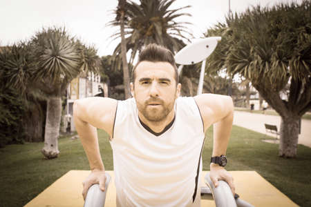 Young and strong. Handsome well built man doing physical exercises while developing his strength