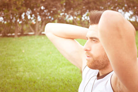 Young man is exercising outdoor. He is stretching his body and warming up for jogging.