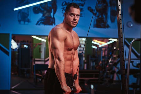Shirtless bodybuilder doing excersise on triceps with hand pull machine in a modern gym looking confident
