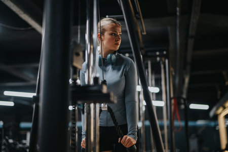 Focused woman in active wear using a cable machine for strength training in a modern gym environment