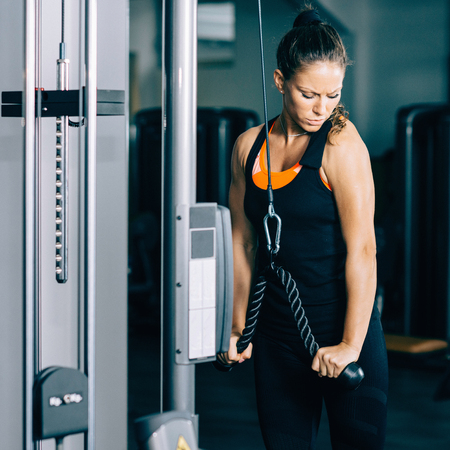 Fitness young woman in sport wear with muscular body doing triceps exercise with ropes in the gym